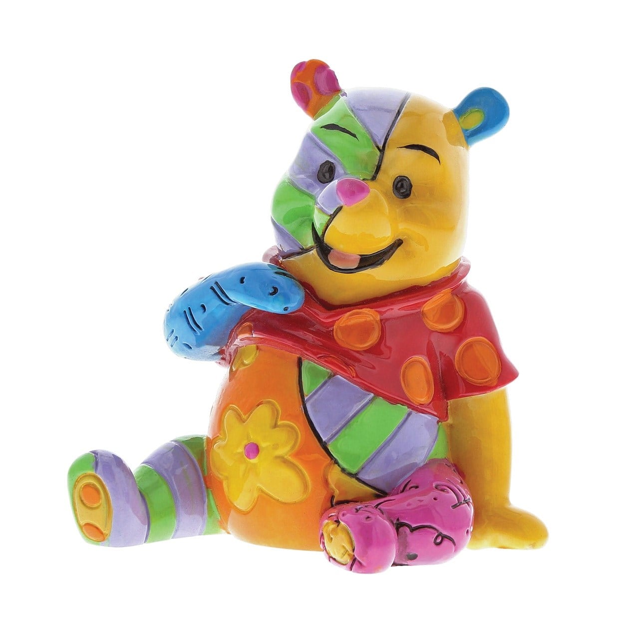 Uluslararası pop sanatçısı fenomeni Romero Britto, Disney'in en sevilen karakterlerini, renk patlamaları ve zarif ayrıntılarla dolu küçük sanat eserlerinde yorumluyor. Romero Britto, resimleri ve heykelleri şu anda dünya çapında 100'den fazla galeride sergilenen bir sanatçı. Britto, "Paylaşmamak için çok önemli bir sanat" diyor. "Ruhu yükselten ve kalbi besleyen". Bu Winnie the Pooh Figür Biblo, çok parlak cilalı reçineden yapılmıştır ve markalı bir pencere hediye kutusunda sunulur. Bu ürün elle boyandığından benzersiz varyasyonlar beklenmelidir. Oyuncak veya çocuk ürünü değildir. Yalnızca yetişkinlere yöneliktir.