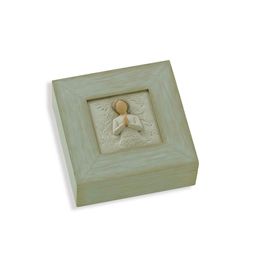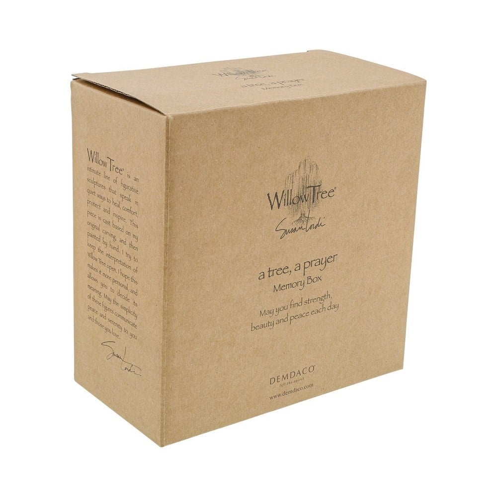 Willow Tree, iyileştirmek, rahatlatmak, korumak ve ilham vermek için sessiz yollarla konuşan samimi bir figüratif heykel serisidir. Sanatçı Susan Lordi, her bir orijinal Willow Tree heykelini elle oyuyor. Bu parça, orijinal oymacılığından döküldü ve ardından elle boyandı. Kutuda dua eden bir kadın bulunmaktadır. Menteşeli kapaklı ince işlenmiş ahşap kutu notlar, anahtarlar, saatler, bozuk para ve mücevherler için güzeldir. Kapağın iç kısmı, bir duyguyu gizli bir keşif olarak ortaya koyuyor. Ürün, içinde Susan Lordi'den imzalı bir not bulunan parşömen eki ve kişisel mesajınız için alanla birlikte "Her gün güç.. Reçine ve ahşap kompozit malzemeden yapılmıştır. El boyaması bu, keder ve yas anında güzel, düşünceli bir hediye..