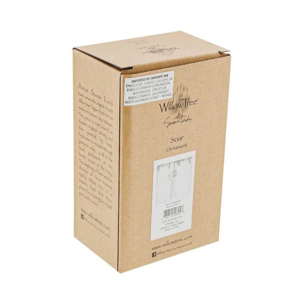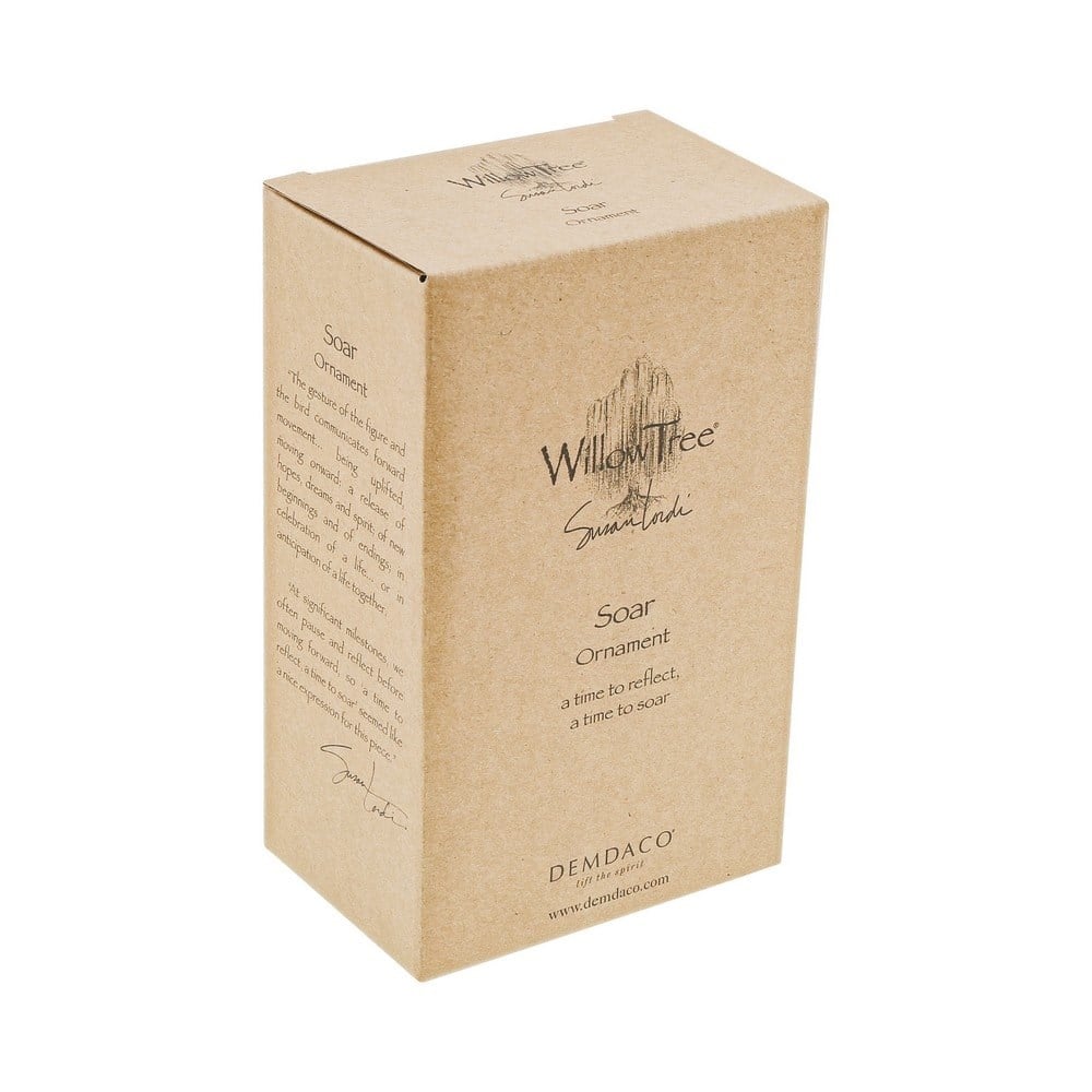 Bireysel gücü teşvik etmek, desteklemek ve kabul etmek için bir hediye. Noel için veya her gün, süs eşyaları hayatın kilometre taşlarını küçük, hatıra formatında kutlar. Bu süs, asmak için kahverengi elastik kordonlu Soar 27173'ün daha küçük boyutlu bir versiyonudur. Figürün ve kuşun hareketi, yeni başlangıçların ve sonların ileriye doğru hareketini iletir; bir hayatın kutlanmasında... veya birlikte bir hayat beklentisinde. Bu parça, birine en iyi dilekleri ifade etmenin bir yolu olabilir. Hayatta yeni bir yola çıkan, hastalıktan kurtulma ya da kendini geliştirme yolunda... Askerlerinin dönüşünü bekleyen asker aileleri için umut dolu bir barış simgesi... Kaybeden birine başsağlığı ifadesi sevilen biri." - Susan Lordi. Bu süs, 'yansıtma zamanı, uçma zamanı' duygusuyla bir hediye etiketi içerir.
