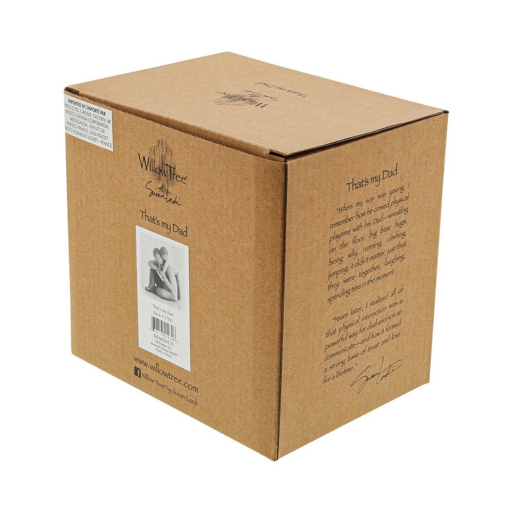 "Oğlum küçükken, babasıyla nasıl fiziksel oyunlar oynadığını hatırlıyorum. Güreş, büyük ayı kucaklaması, koşma, tırmanma, zıplama. Farketmiyordu çünkü beraber gülüp zaman geçiriyorlardı. Yıllar sonra, fiziksel oyunların baba ve oğul arasındaki en güçlü iletişim yolu olduğunu ve ömürlük güven ve sevginin güçlü temellerini oluşturduğunu keşfettim" Susan LordiÜrün reçineden yapılmıştır ve el boyamadır. Kendi özel kutusunda içinde "My favourite time is time with you" yazılı kart ile beraber gelir. Willow Tree kelimelerin ötesinde hediyeler sunar.